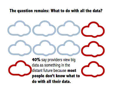 Responses noted that big data is too intimidating (7%), the tools and strategies to address big data aren't available yet (22%) and other HIT initiatives such as ICD-10 or Stage 3 MU are taking precedence over big data (31%), while the majority of respondents said most organizations don't know what to do with all their data (40%). Because these responses are all interconnected in various ways, let's address each one.